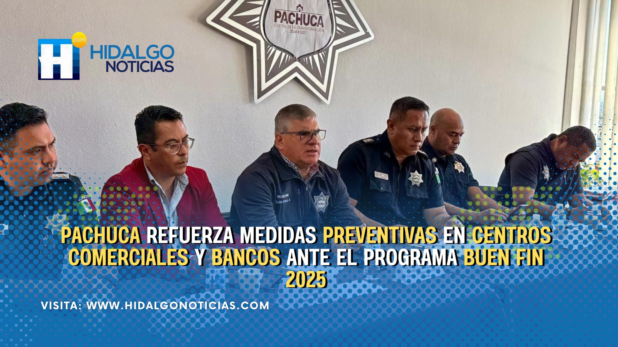 Pachuca, Hgo.— Con el objetivo de garantizar la seguridad de comerciantes, visitantes y familias durante la temporada del Buen Fin, la Secretaría de Seguridad Pública, Tránsito y Vialidad de Pachuca sostuvo una reunión con representantes y gerentes de distintos centros comerciales de la capital, en la que se definieron acciones preventivas para reforzar la vigilancia y atención ciudadana.