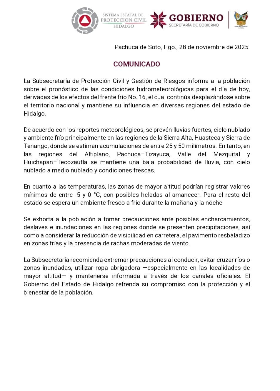 Pachuca de Soto, Hgo., 26 de noviembre de 2025.— La Subsecretaría de Protección Civil y Gestión de Riesgos informó que las condiciones hidrometeorológicas para este día estarán marcadas por los efectos del frente frío número 16, sistema que continúa avanzando sobre el territorio nacional y mantiene su influencia en diversas zonas del estado de Hidalgo.
