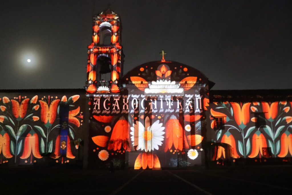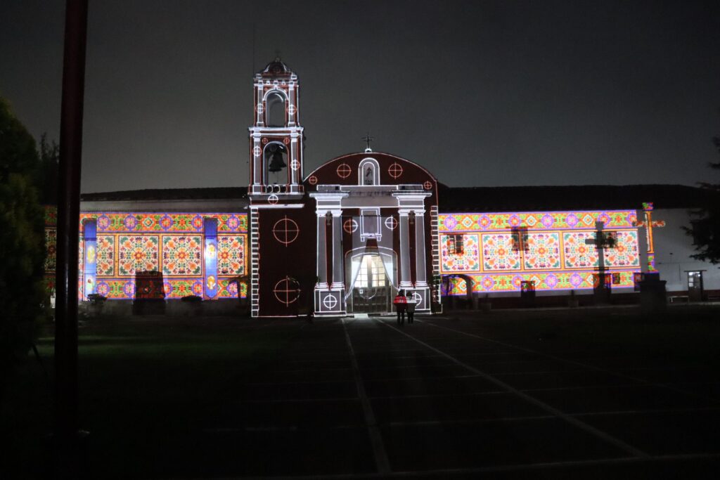 La técnica del videomapping, utilizada por primera vez en el municipio, transformó la fachada de la Parroquia de la Asunción de María Santísima —edificada en el siglo XVII— en un lienzo dinámico que envolvió al público en una experiencia sensorial única. La proyección incluyó escenas que evocaron a médicas y médicos tradicionales, la gastronomía ancestral basada en hongos y plantas silvestres, los paisajes emblemáticos de la región, los tapetes monumentales elaborados por artesanos locales y la devoción al Señor del Colateral.