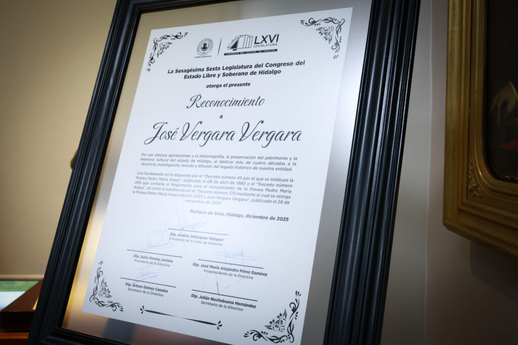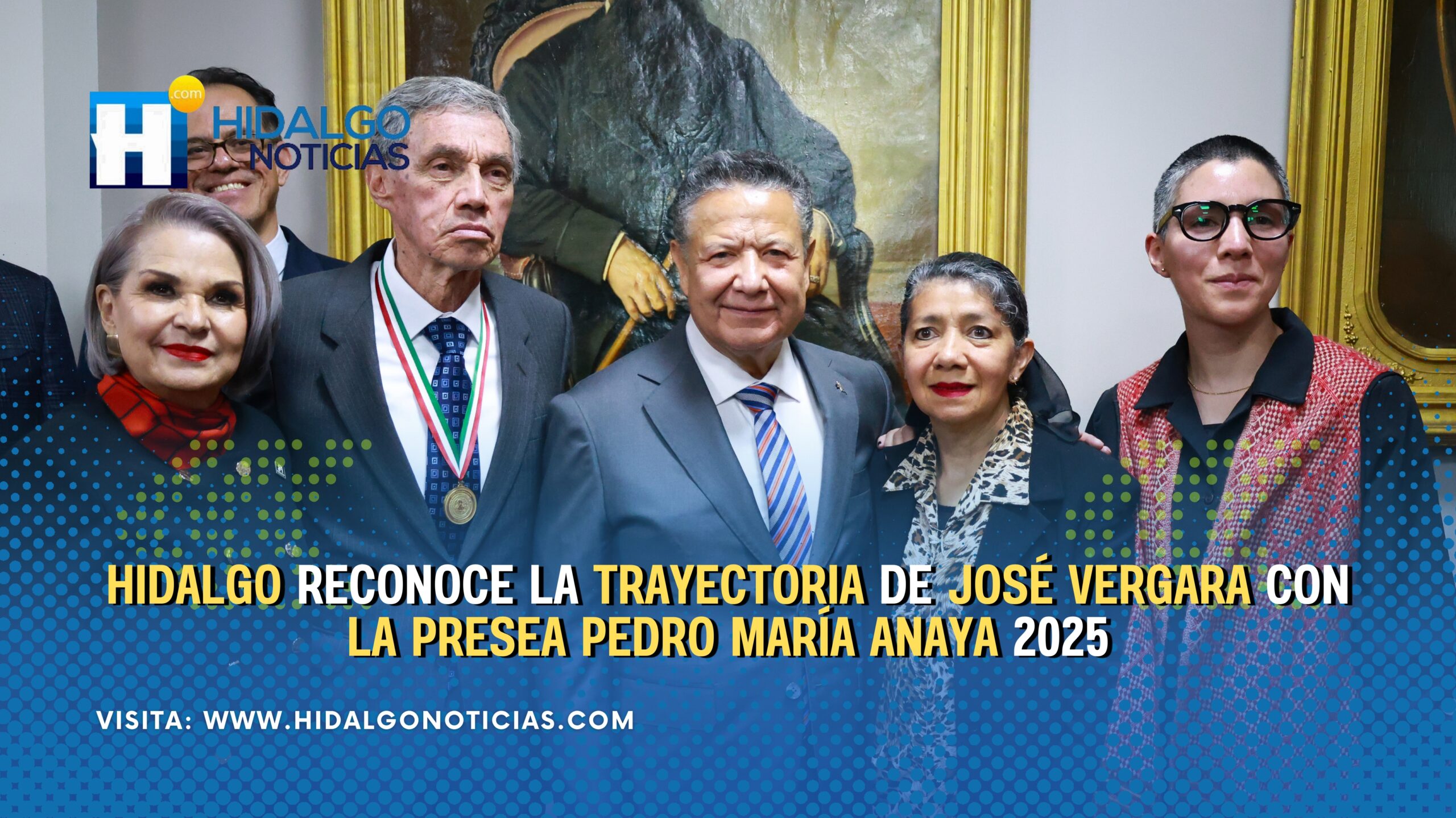 Diciembre de 2025, Pachuca, Hidalgo. En sesión solemne del Congreso del Estado, fue entregada la Presea Pedro María Anaya 2025 a José Vergara Vergara, acto en el que el gobernador Julio Menchaca Salazar subrayó la importancia de preservar la memoria histórica como un elemento esencial para comprender la identidad y el rumbo de Hidalgo.