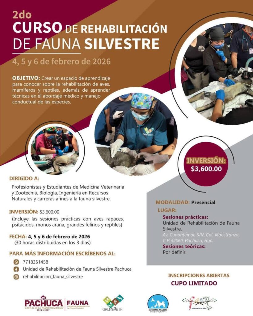 Febrero de 2026, Pachuca, Hidalgo. Con el propósito de elevar el nivel de especialización en la atención, recuperación y manejo de especies silvestres, los días 4, 5 y 6 de febrero de 2026 se realizará el Segundo Curso de Rehabilitación de Fauna Silvestre, un programa de formación presencial orientado al fortalecimiento de capacidades técnicas y profesionales en este ámbito.