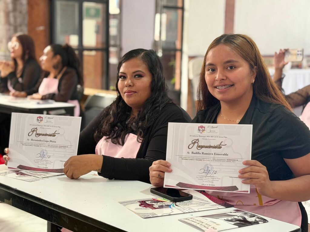 El Arenal, Hidalgo, 8 de diciembre de 2025.— El presidente municipal Jensen Oropeza encabezó la entrega de constancias a mujeres que concluyeron el curso de aplicación de pestañas, capacitación orientada a fortalecer sus habilidades y abrir oportunidades de emprendimiento dentro del sector de servicios de belleza.