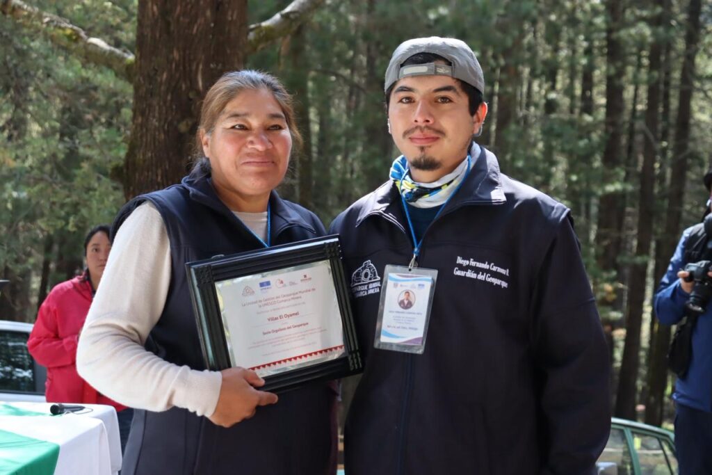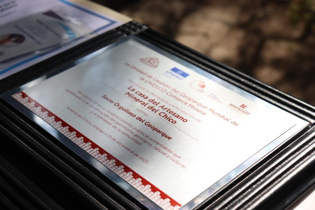 10 de diciembre de 2025, Huasca de Ocampo, Hidalgo.— Como parte de los programas orientados al desarrollo local, la equidad de género, la inclusión y el cuidado ambiental, fueron instalados nuevos paneles interpretativos en geositios estratégicos del Geoparque Mundial Comarca Minera UNESCO. En este marco también se entregaron constancias a los Guardianes del Geoparque, así como placas de reconocimiento “Socio Orgulloso” a productores, artesanos y prestadores de servicios turísticos comprometidos con la conservación del patrimonio natural y cultural.