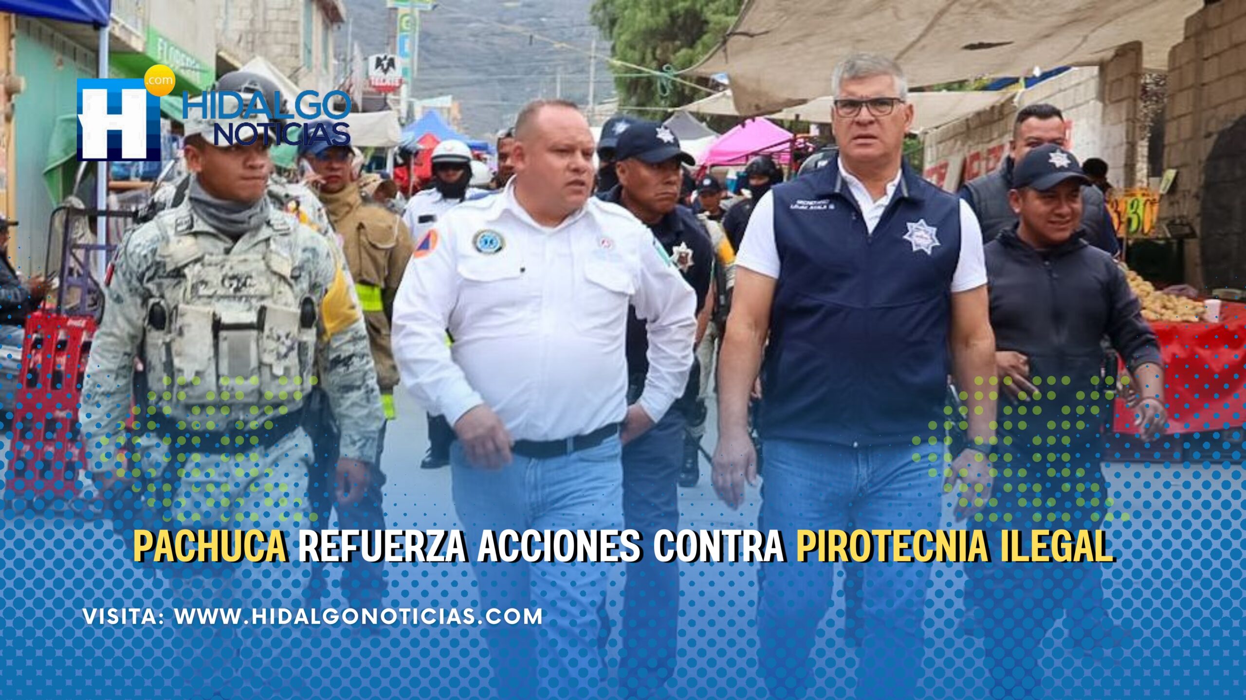 Pachuca de Soto, 5 de diciembre de 2025. Por instrucción del alcalde Jorge Reyes, este domingo comenzó un operativo especial encabezado por la Secretaría de Seguridad Pública Municipal y la Dirección de Protección Civil, con el propósito de reducir la venta y circulación de pirotecnia ilegal en mercados, zonas de alta afluencia y espacios públicos de la capital.
