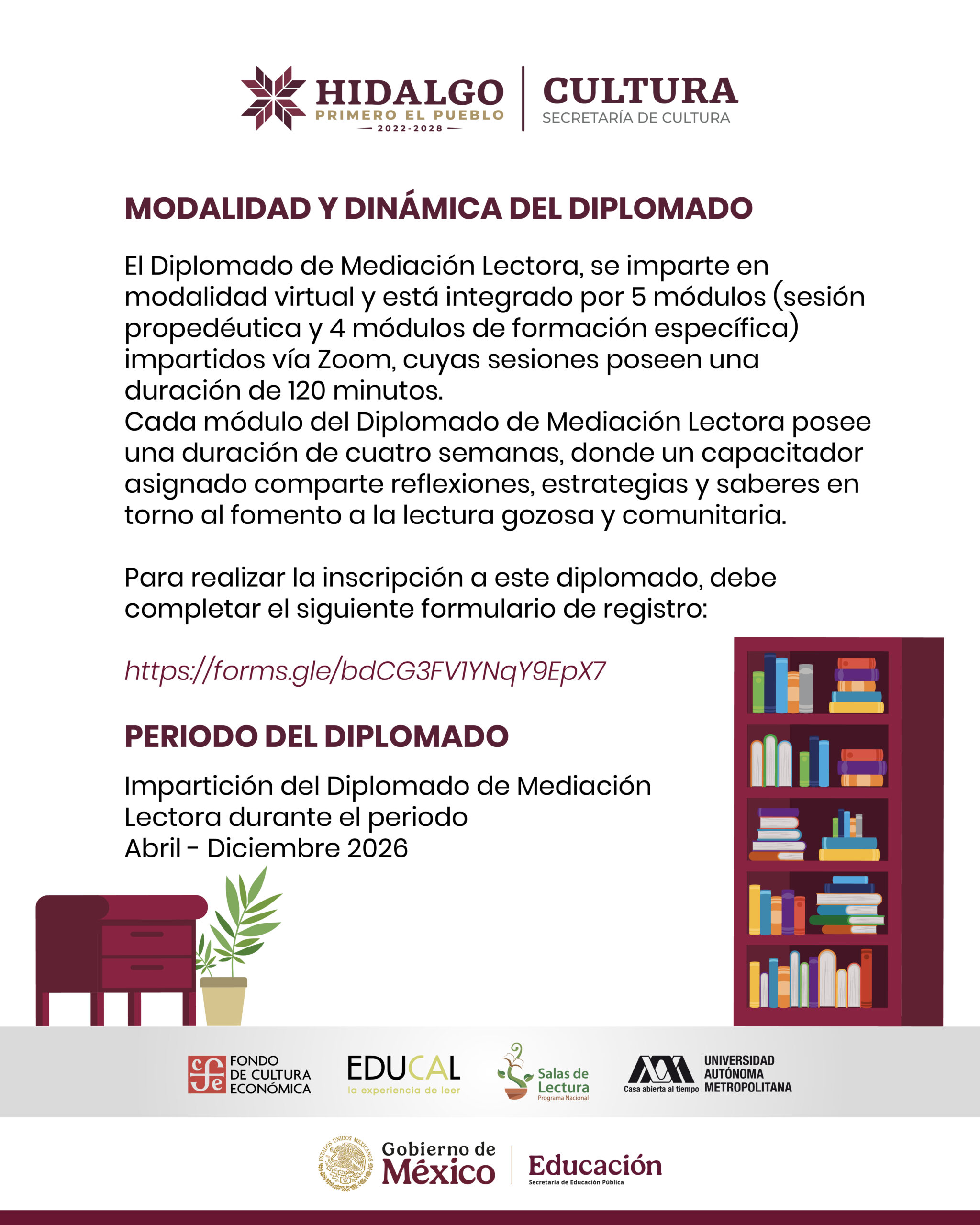 El diplomado se desarrollará en modalidad virtual, a través de sesiones organizadas por módulos, combinando reflexión, intercambio de experiencias y herramientas prácticas para fomentar la lectura recreativa y colectiva. La formación se llevará a cabo durante el periodo comprendido de abril a diciembre de 2026.