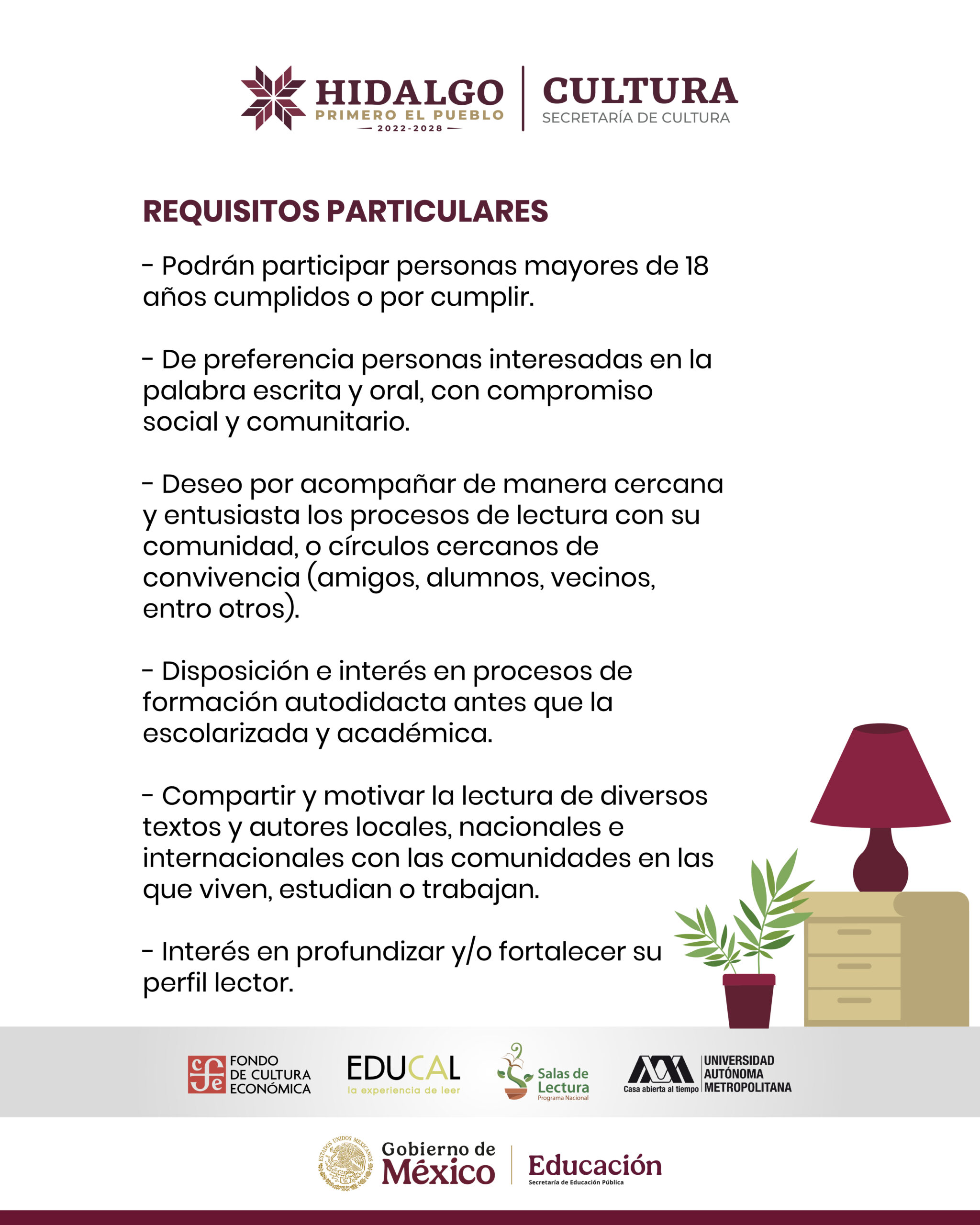 La convocatoria está dirigida a personas mayores de 18 años que radiquen en Hidalgo y que cuenten con vocación de servicio, gusto por la lectura y compromiso con su entorno. Se busca un perfil con disposición para acompañar procesos lectores desde una perspectiva incluyente, cercana a la vida cotidiana y con enfoque comunitario.