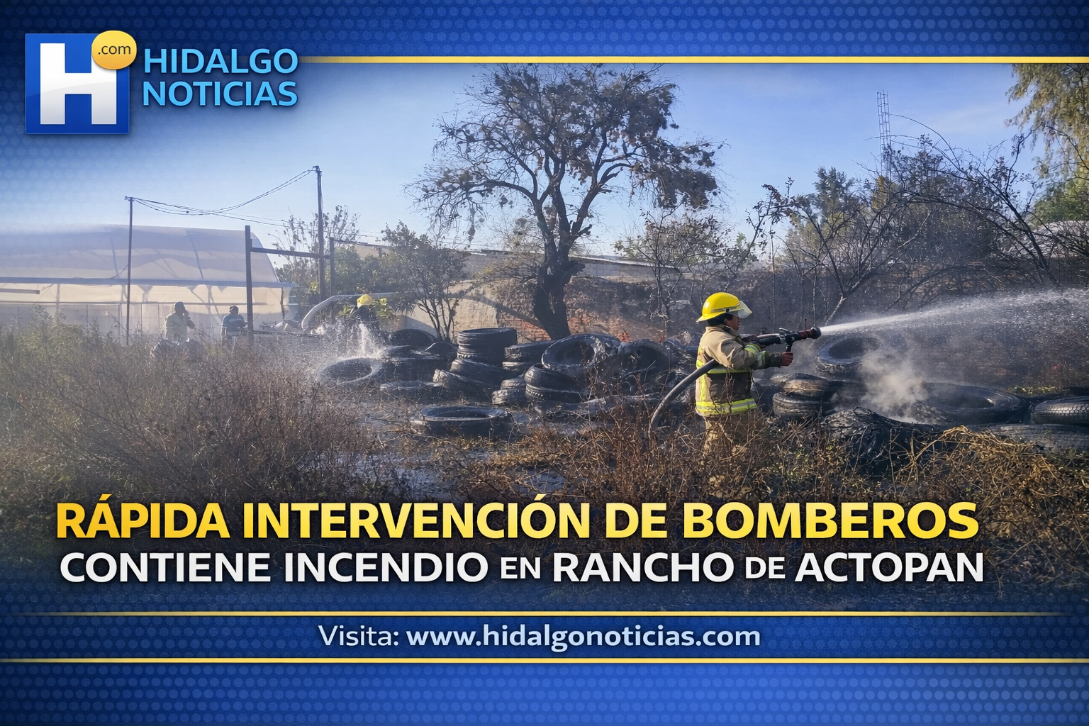 Actopan, Hidalgo, 7 de enero de 2026. Un incendio registrado la tarde de este martes en el rancho conocido como “Aleka”, en la comunidad de Daxtha, movilizó de inmediato a personal de la Dirección de Protección Civil y Bomberos de Actopan, luego de que el fuego se propagara sin control a consecuencia de la quema de maleza y neumáticos, generando un riesgo directo para los invernaderos ubicados en las inmediaciones del lugar.