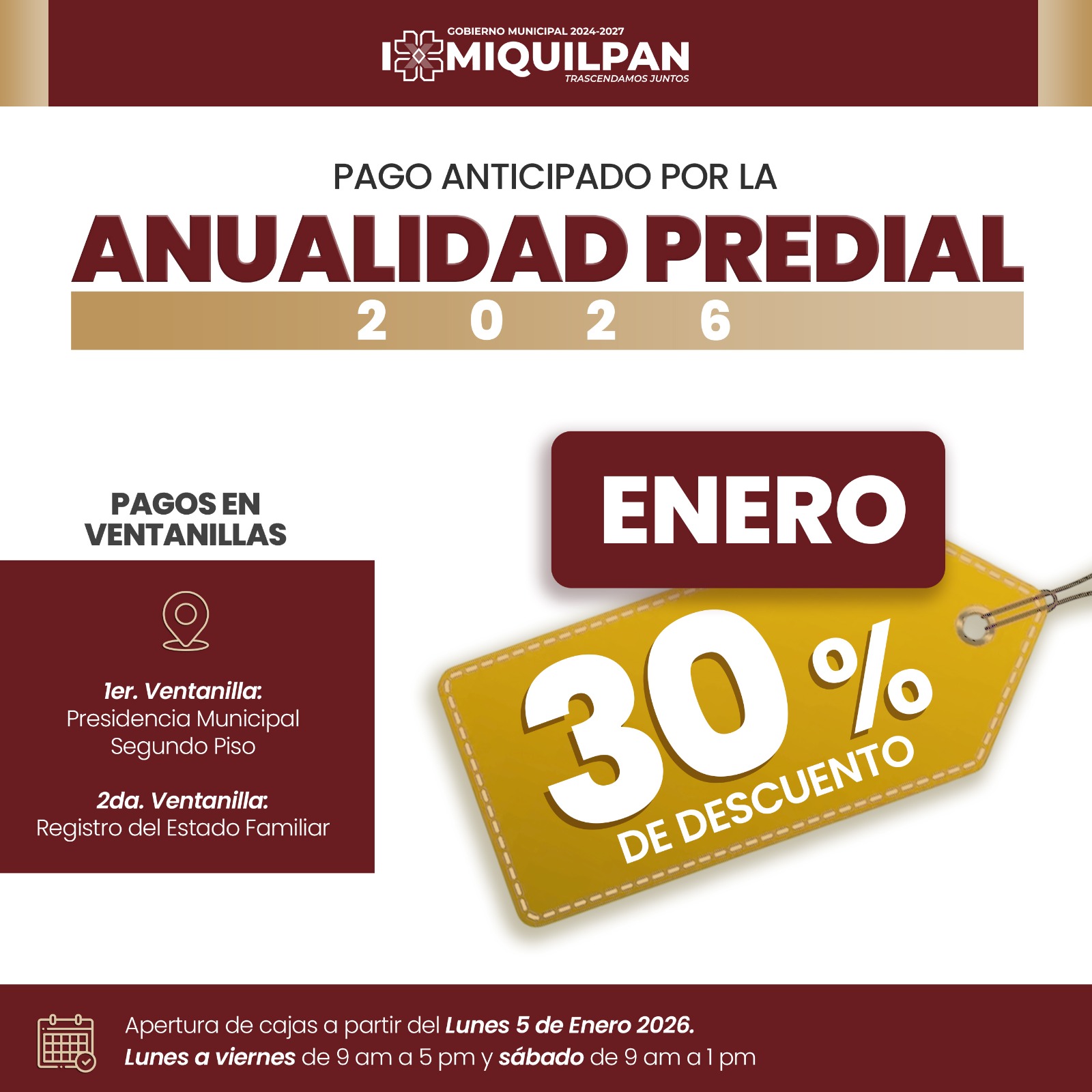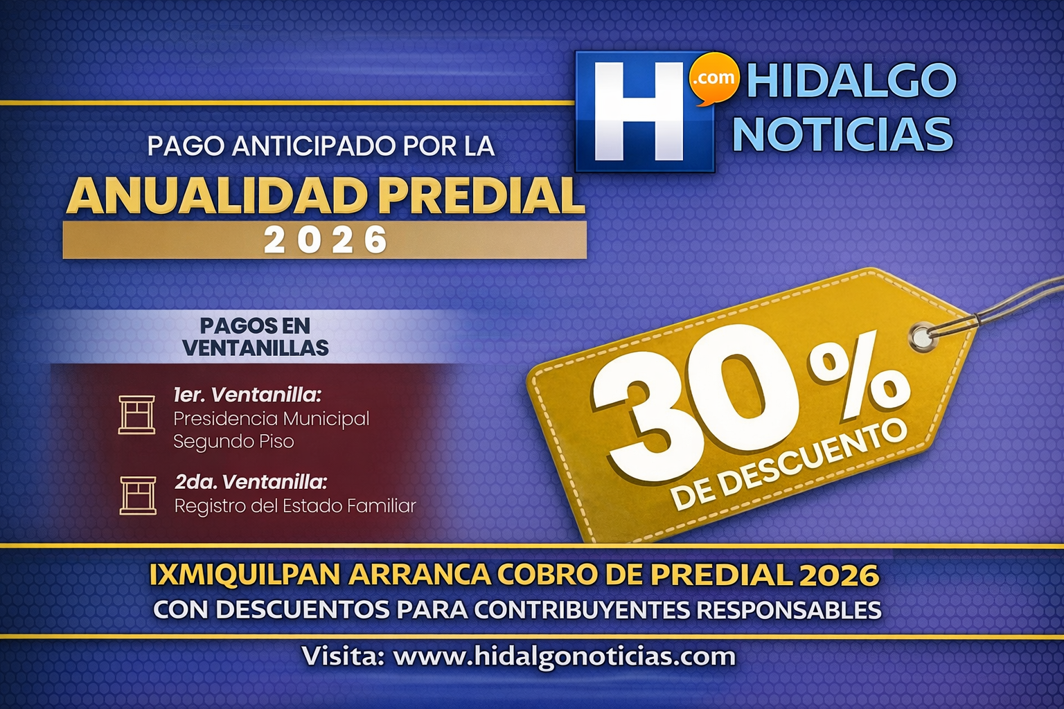 5 de enero de 2026, Ixmiquilpan, Hidalgo. El municipio dio inicio a la recaudación del impuesto predial correspondiente al ejercicio 2026, invitando a la ciudadanía a cumplir oportunamente con esta obligación fiscal y aprovechar los incentivos económicos por pronto pago, los cuales buscan fortalecer las finanzas municipales y contribuir al desarrollo de obras y servicios públicos.
