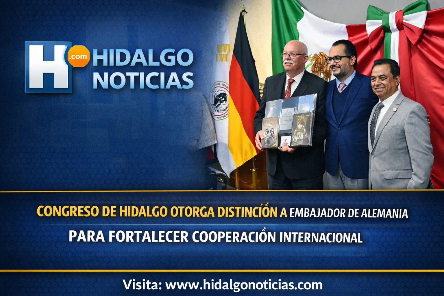 Enero de 2026, Pachuca de Soto, Hidalgo. La Comisión de Asuntos Internacionales del Congreso del Estado entregó la distinción “La Mina del Tiempo” al embajador de la República Federal de Alemania en México, Clemens von Goetze, como reconocimiento a su labor diplomática y como un gesto para estrechar los vínculos de cooperación entre Hidalgo y el país europeo.
