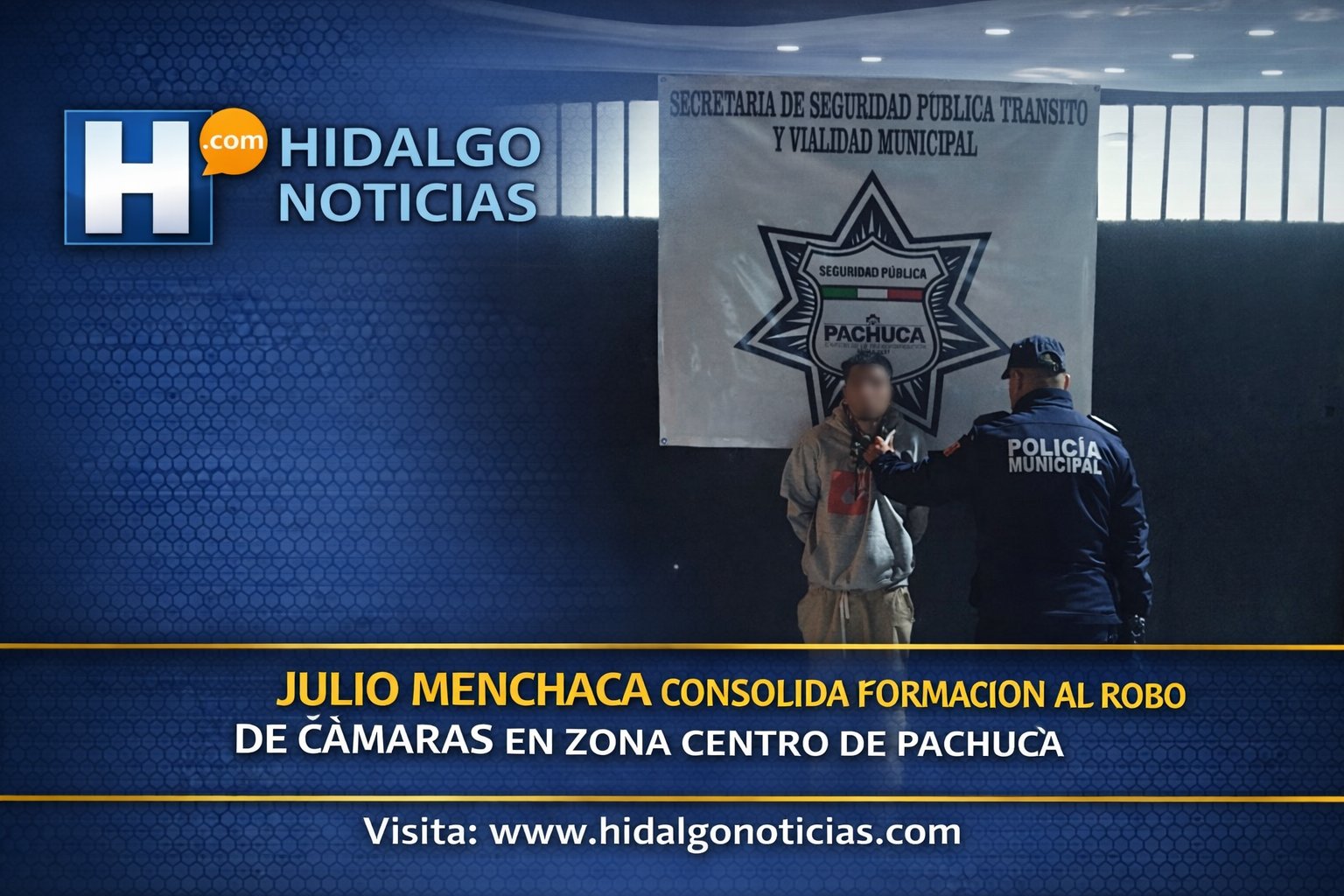 26 de enero de 2026, Pachuca de Soto, Hidalgo. Derivado de un reporte canalizado a través del sistema de monitoreo C4, elementos de la Secretaría de Seguridad Pública, Tránsito y Vialidad detectaron a un individuo presuntamente relacionado con el robo de cámaras de videovigilancia registrado sobre la calle Guerrero, a la altura de un establecimiento comercial de la zona.