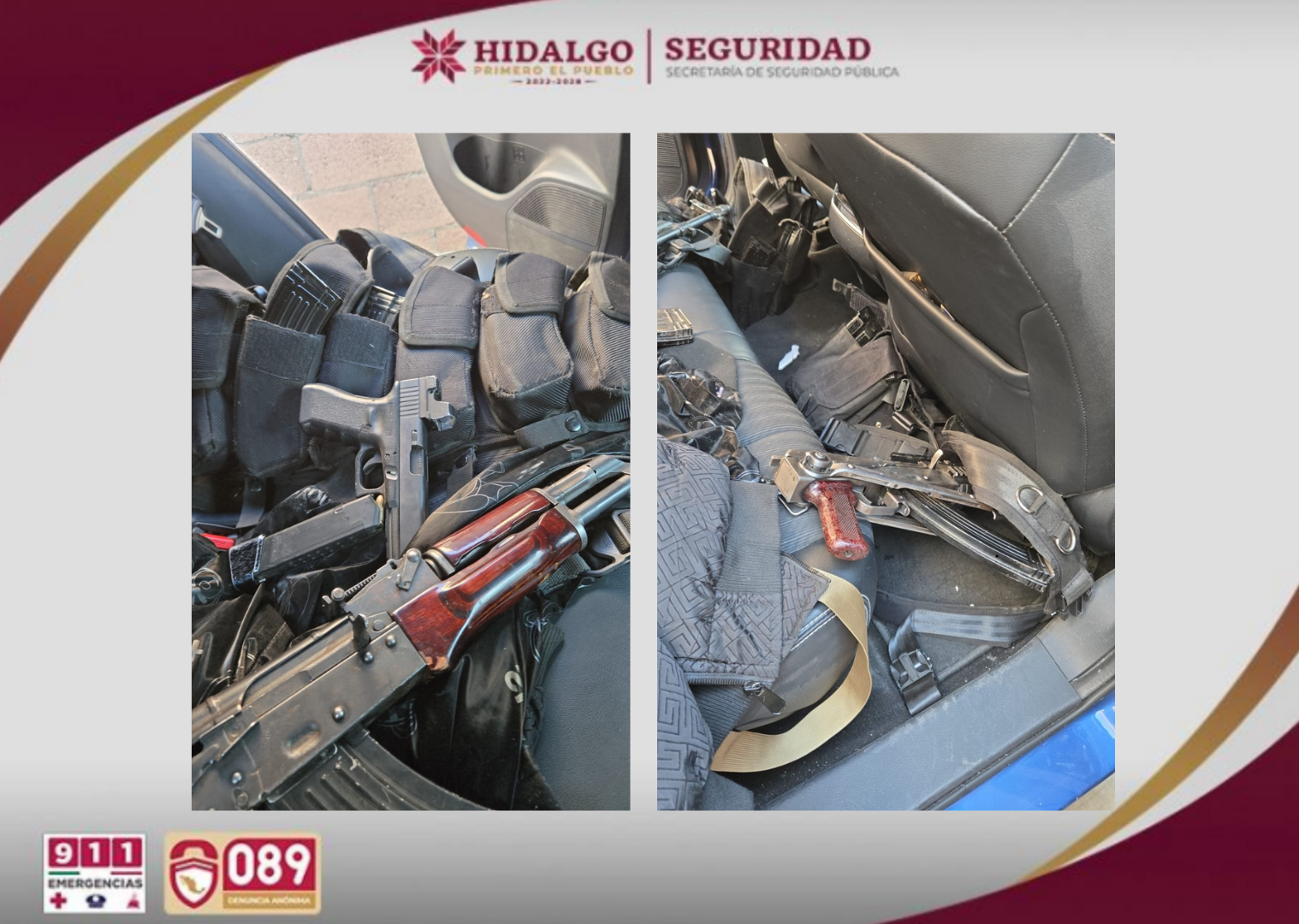De manera paralela, en la colonia 18 de Marzo del municipio de Atitalaquia, fue localizada y asegurada una camioneta Journey color azul, en la que viajaban cuatro personas, en su mayoría originarias del estado de Jalisco. Durante esta intervención se decomisaron armas largas, decenas de cargadores abastecidos, un arma corta, equipo táctico y diversas dosis de presuntas sustancias ilícitas. Las autoridades señalaron que los vehículos asegurados estarían vinculados con agresiones recientes registradas en la región.