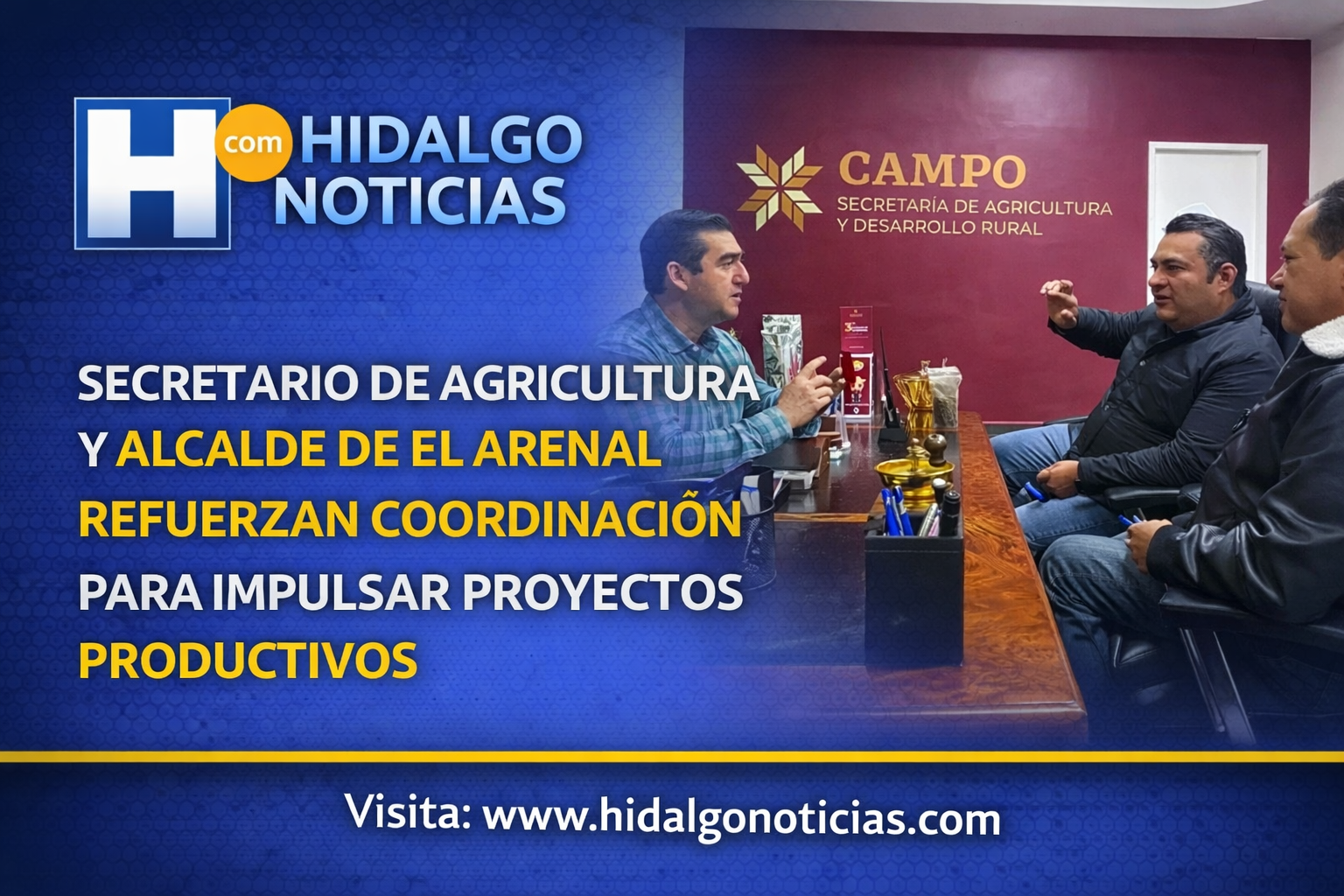 2 de febrero de 2026, El Arenal, Hidalgo.– El secretario de Agricultura del estado, Napoleón González Pérez, sostuvo una reunión de trabajo con el presidente municipal, Jensen Oropeza, con el propósito de dar seguimiento a proyectos en marcha y fortalecer la coordinación institucional en beneficio de la población local.