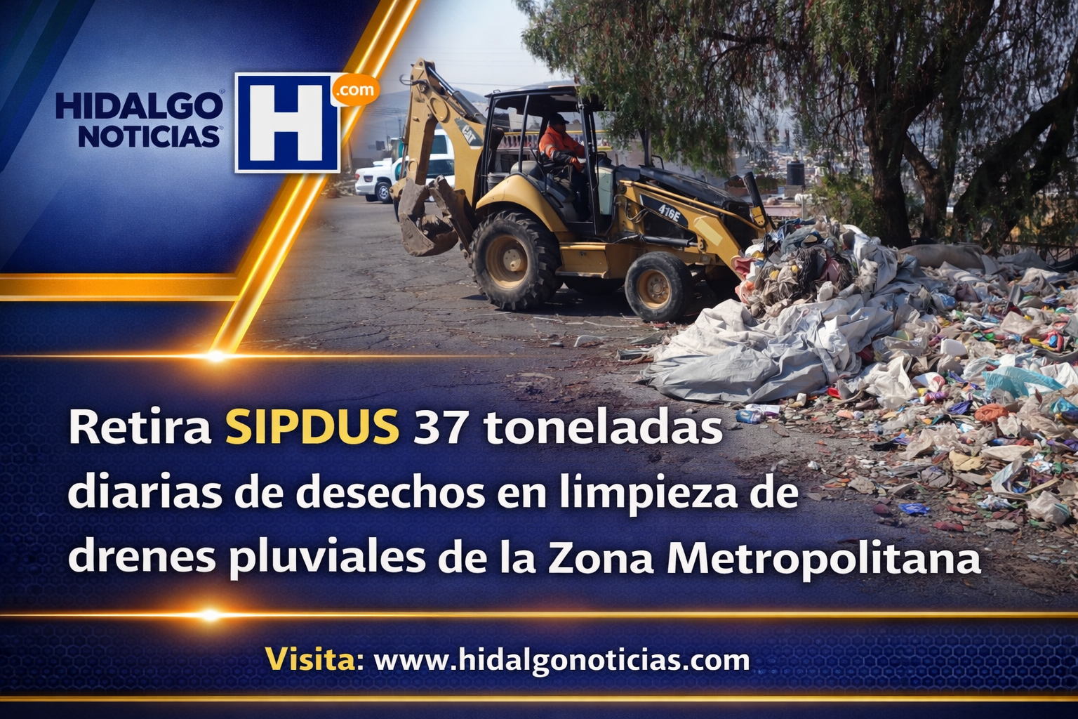 Pachuca, Hidalgo, 19 de marzo de 2026.— Con el objetivo de reducir riesgos durante la próxima temporada de lluvias, la Secretaría de Infraestructura Pública y Desarrollo Urbano Sostenible (SIPDUS) intensificó los trabajos de limpieza y desazolve en los principales drenes pluviales de la Zona Metropolitana de Pachuca, donde diariamente se retiran alrededor de 37 toneladas de residuos.