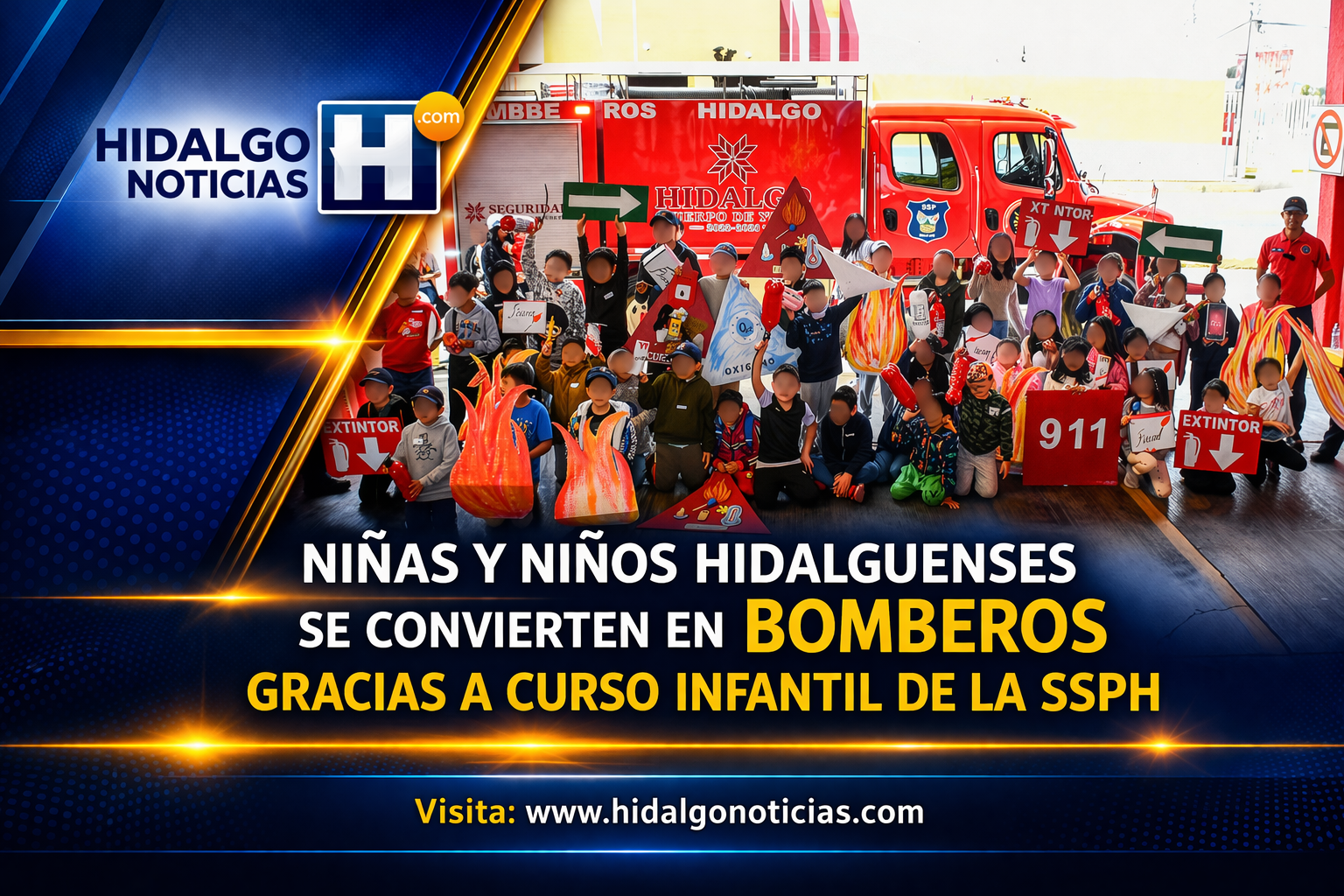 Niñas y niños en Hidalgo participan en actividades educativas con bomberos para aprender prevención y cómo actuar ante situaciones de riesgo.