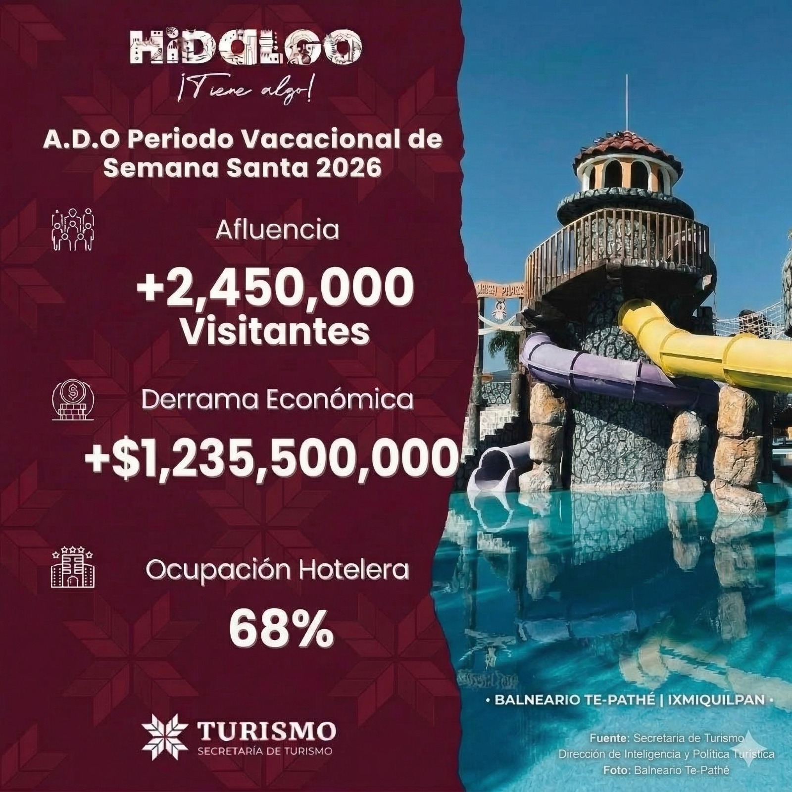 Hidalgo supera 2.4 millones de visitantes en Semana Santa 2026 y genera derrama de más de mil 235 millones de pesos.