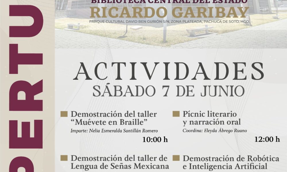Pachuca, Hgo., 6 de junio de 2025.— Este sábado 7 de junio, la Biblioteca Central del Estado de Hidalgo Ricardo Garibay volverá a abrir sus puertas...