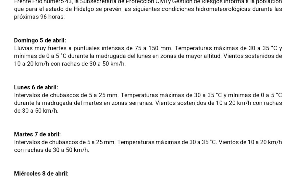 Autoridades alertan por lluvias, viento y cambios de temperatura en Hidalgo por el frente frío 43.