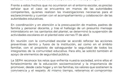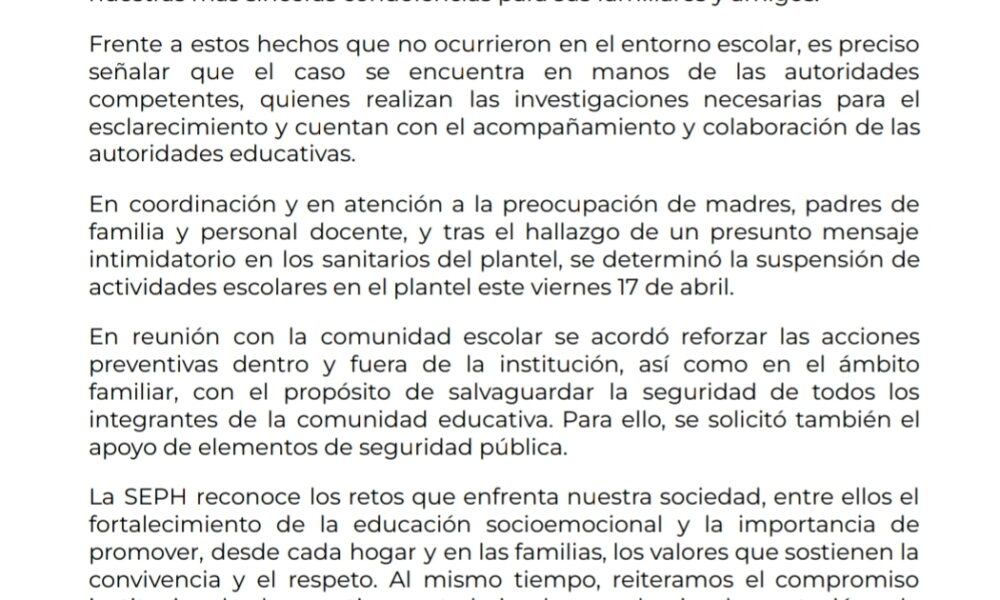 Autoridades educativas suspendieron clases en una secundaria de Tizayuca tras un hecho en investigación y medidas preventivas en el plantel.