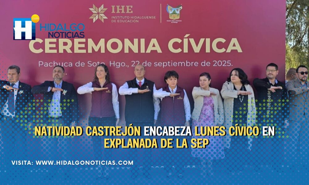 Pachuca, Hgo., 22 de septiembre de 2025.— El secretario de Educación Pública de Hidalgo, Natividad Castrejón Valdez, encabezó la ceremonia del Lunes Cívico en la explanada...